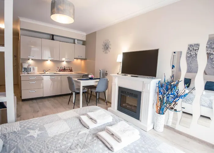 Das Apartamenty Trzy Korony blisko Plaży by Noclegi Renters liegt nur 350 m vom Strand in Swinemünde entfernt und bietet moderne Selbstversorgerunterkünfte. Die Apartments verfügen über eine voll ausgestattete Küchenzeile und eine Sitzecke mit einem Flachbild-TV. Ideal für Familien, da kostenfreies WLAN und die Möglichkeit, Fahrräder zu leihen, zur Verfügung stehen. Die ruhige Lage und die Nähe zum Kurpark machen es besonders attraktiv für entspannende Aufenthalte.